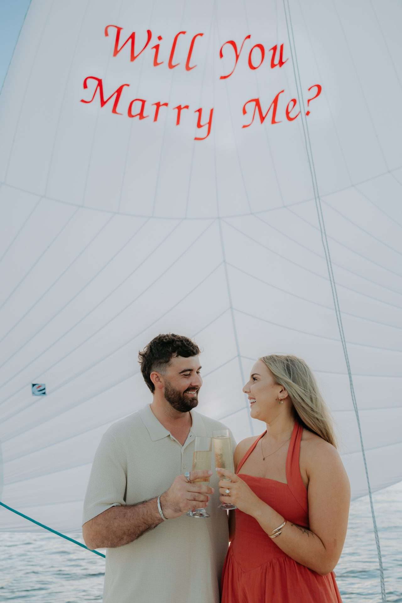 What sets a sailing yacht proposal apart from other engagement ideas? At Sun Sailing, we offer an exclusive "Will You Marry Me?" spinnaker that unfurls as you ask the most important question of your life. This dramatic reveal creates a picture-perfect moment that's as cinematic as it is genuine. Imagine your partner's face when they see those special words billowing in the breeze as you get down on one knee, it's a memory neither of you will ever forget.